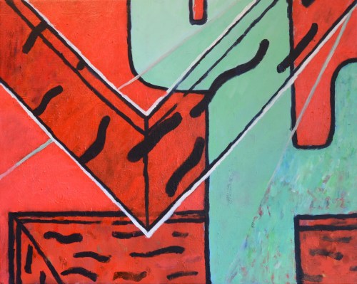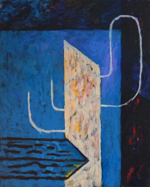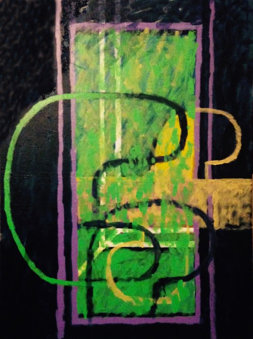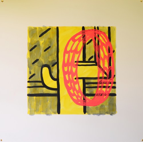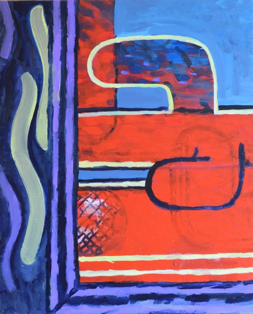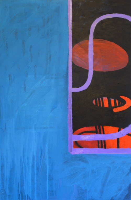 These paintings are a continuation of the work started in the series of paintings, Concentrated Daydreaming (2015), with the artist working directly in a state of flow without drawings. The same glyphs are used such as: picture frame and wood pattern, and tubes/penises. However, they do divert from that body of work distinctly in that they are heavily overpainted and altered. This leads to a very formalised picture plain but can also lead the images becoming overworked and at this point the artwork is generally destroyed and disposed of.