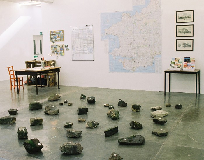 Fragments from the Landsker line archive is activated by my unauthorised taking of stones from these Norman Castles, this is the central focus of this exhibition. Hopefully the viewer will question my authority to take stones, and consider questions of ownership, land rights and the authorship of heritage and history. The authors of our heritage are taking sites originally scenes of land-grabs and massacres (atrocities still raging in the present day world), and repackaging this weight of history as popular culture e.g. tourism, postcards, tea towels.